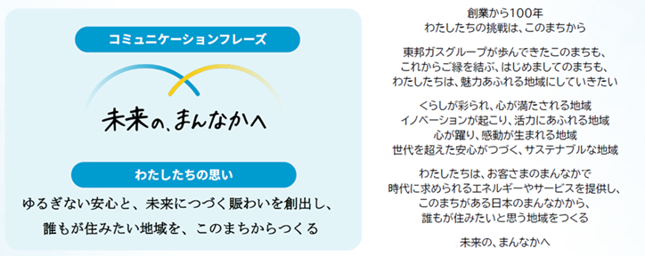 2025年3月には、当社グループが大切にしていきたい考え方をまとめた「わたしたちの思い」を制定し、エネルギーに留まらない価値を提供していく新しい企業イメージを表現するためコミュニケーションフレーズ「未来の、まんなかへ」を公表しました。