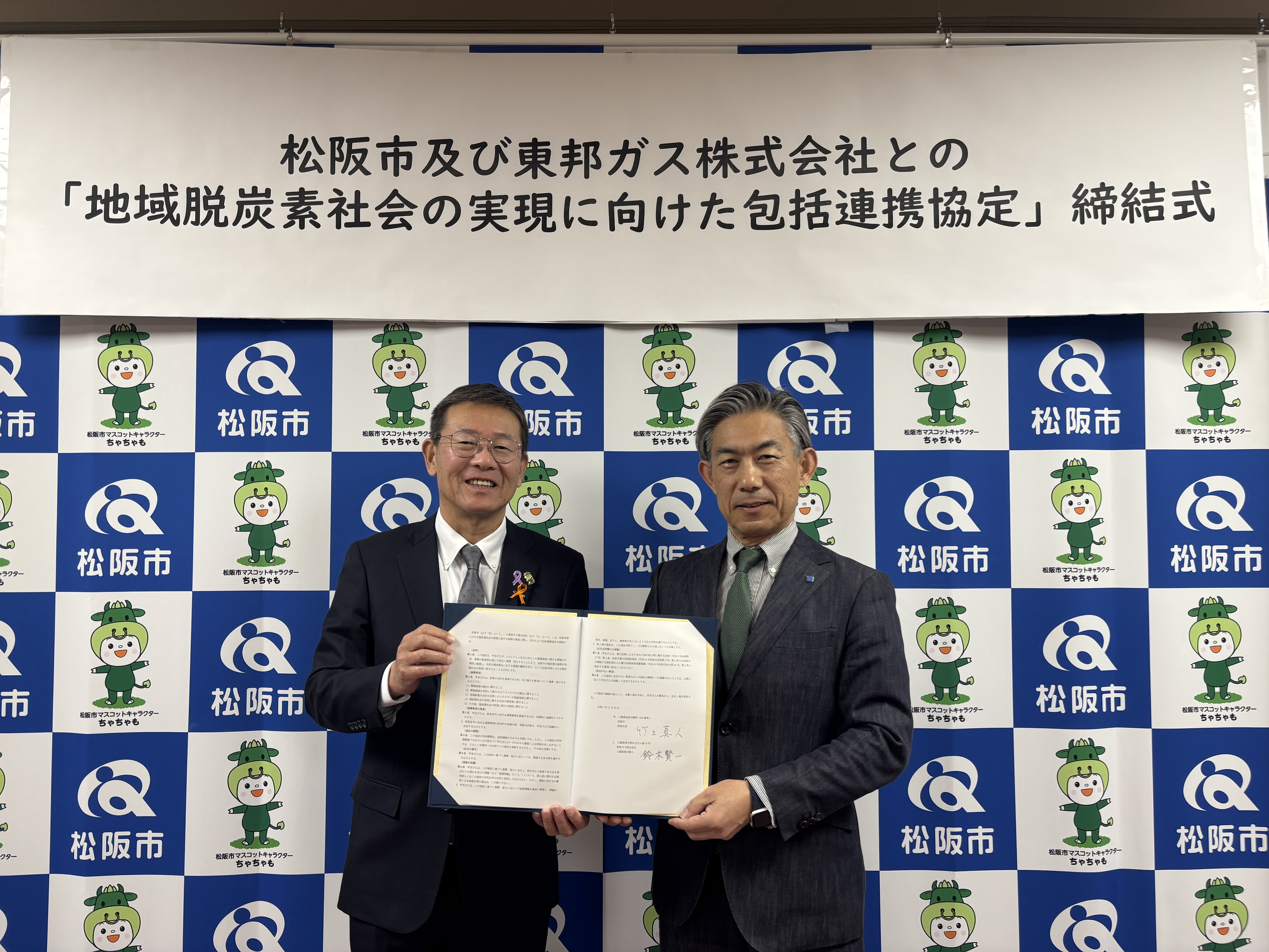 東邦ガス株式会社(社長:山碕 聡志)は、本日、松阪市(市長:竹上 真人)と「地域脱炭素社会の実現に向けた包括連携協定」(以下「本協定」)を締結しました。