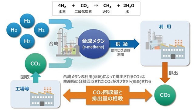 e-メタンは、水素とCO2を原料に製造された合成メタンであり、当社は、都市ガスの円滑な脱炭素化に貢献できる手段として、2030年の社会実装を目指しています。