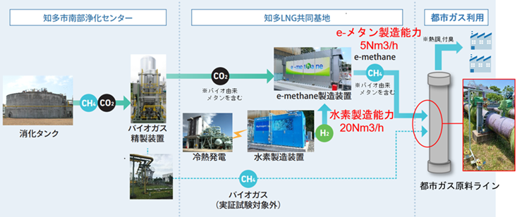 本実証は、知多市南部浄化センターで発生するバイオガス由来のCO2と、冷熱発電※2による電力を活用した水素を原料としてe-メタンを製造するため、環境性の高い取り組みです。