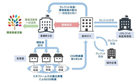 当社は、本プロジェクトにおいて、同町内に設置された家庭用燃料電池システム「エネファーム」※1および家庭用太陽光発電システムによるCO2排出削減量のJ-クレジット※2化と、同町内での活用による環境価値の地産地消を行うことを通じて、同町におけるカーボンニュートラルの実現を目指します。