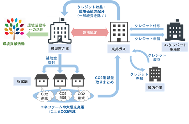 当社は、本プロジェクトにおいて、同市内に設置されたエネファームおよび家庭用太陽光発電システムによるCO2排出削減量のJ-クレジット※2化と、その環境価値の有効活用を通じて、同市におけるゼロカーボンシティの実現を目指します。