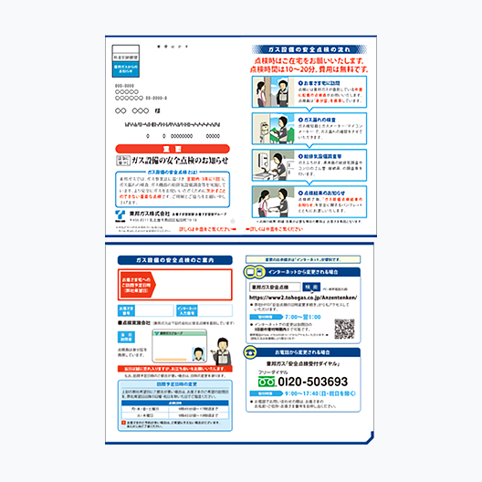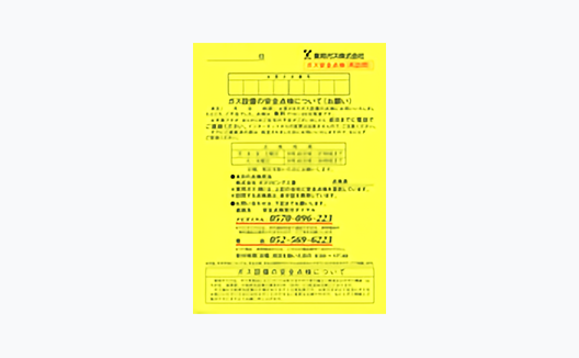 ガス設備の安全点検にお伺いするときは、前もって右のおハガキでご訪問予定日(弊社希望日)と時間をお知らせしております。