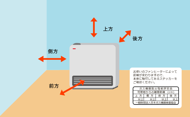ファンヒーターやストーブは周囲の家具や壁から安全な距離を取って使用しましょう。