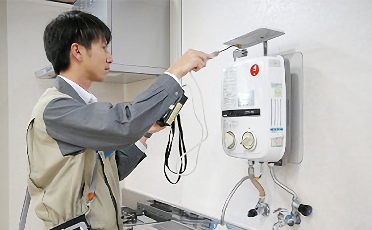 - 不完全燃焼防止装置の付いていない小型湯沸器等をお持ちのお客さまに対しては、4年に1回以上の安全点検で対面した際に、安全性の高いガス機器への取替をお勧めしています。あわせて、小型湯沸器の一酸化炭素濃度を測定し、お客さまに機器の燃焼状態をお伝えしています。