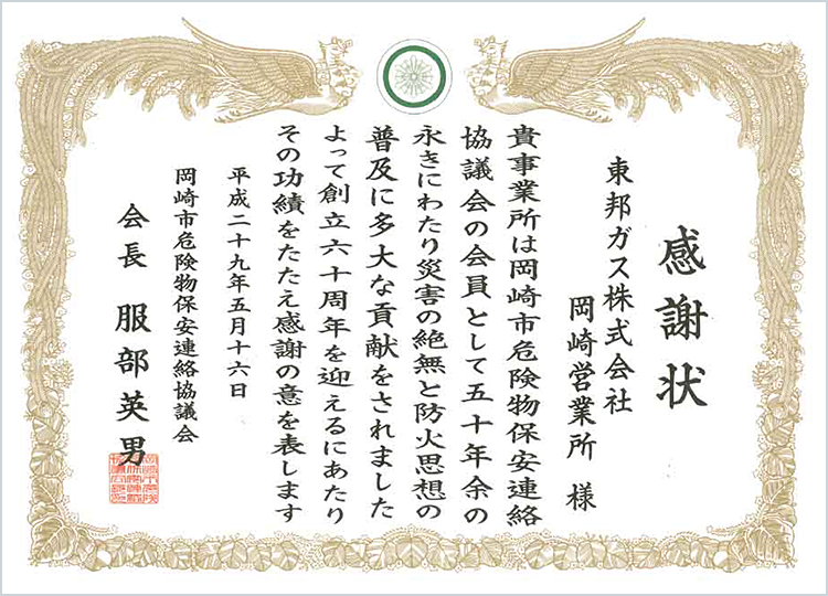 - 愛知県から委託された一般社団法人愛知県危険物安全協会連合会(岡崎市危険物保安連絡協議会)から、災害の絶無と防火思想の普及に多大な貢献をしたとして、感謝状をいただいています。