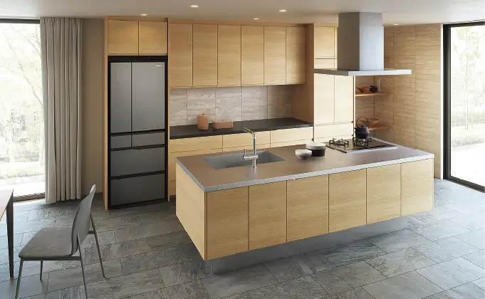 床や壁の色に合わせてコーディネートすることで、キッチンが空間全体になじみ、より素敵に。収納扉やコンロなども、お好みに合わせて自由に組み合わせできます。