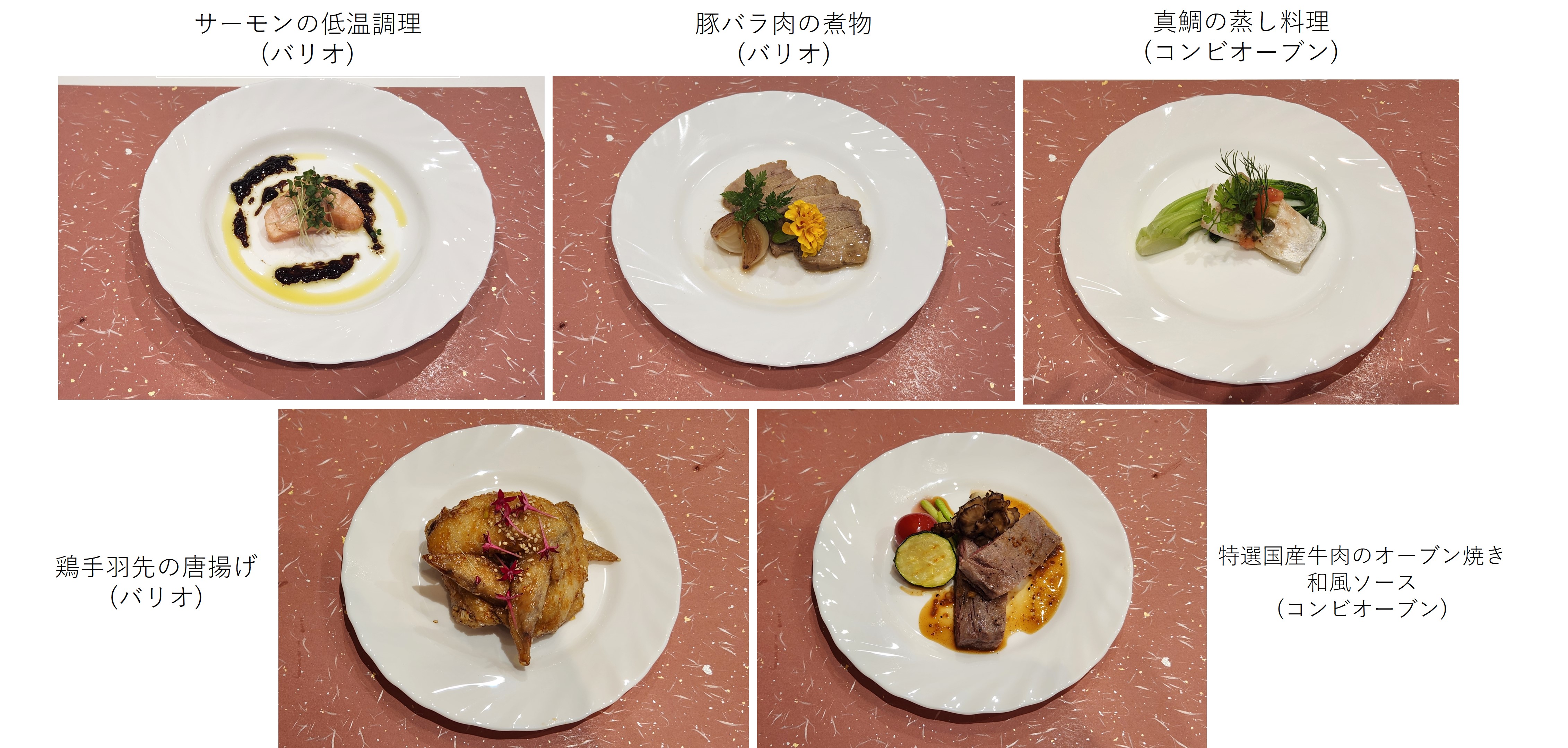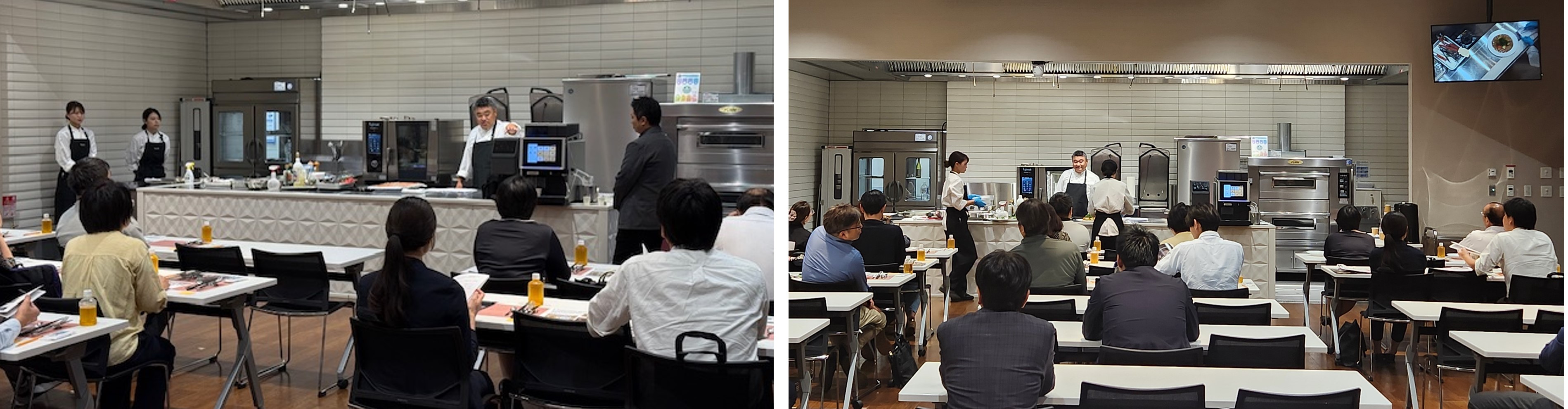 【内 容】㈱フジマック 名古屋営業部の開所66周年を記念し、フジマックコーポレートシェフによるスペシャルライブが開催されました。「コンビオーブン-Combi Oven」で2品、「バリオ-Vario」で3品、「パコジェット-Pacojet」で1品、計6品のメニューが紹介され、事前に準備したレシピを基に調理過程やポイントを講じながら実演を行っていただきました。
