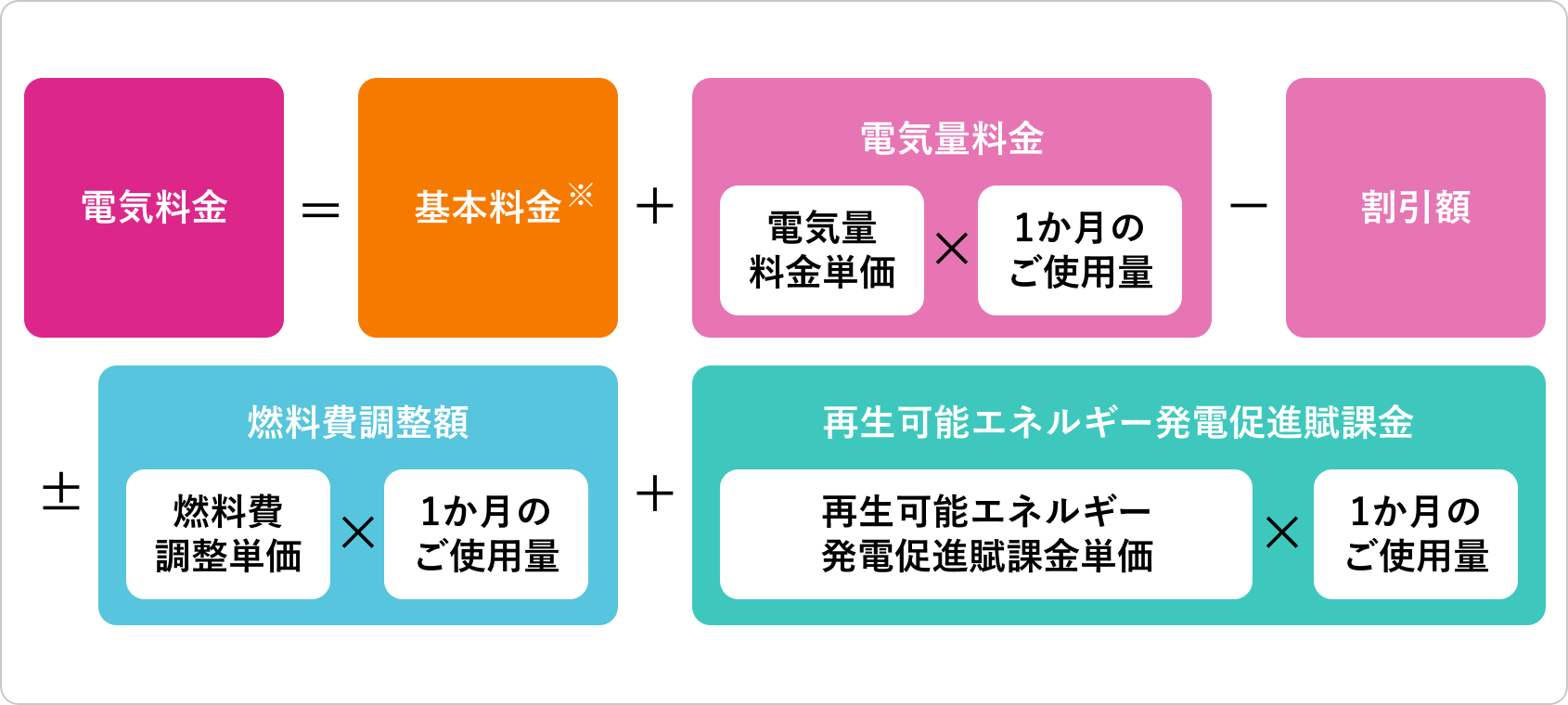電気料金は毎月、燃料費調整額を加減いたします。また、電気料金の一部として、電気のご使用量に応じて再生可能エネルギー発電促進賦課金をご負担いただきます。消費税など相当額を含みます。